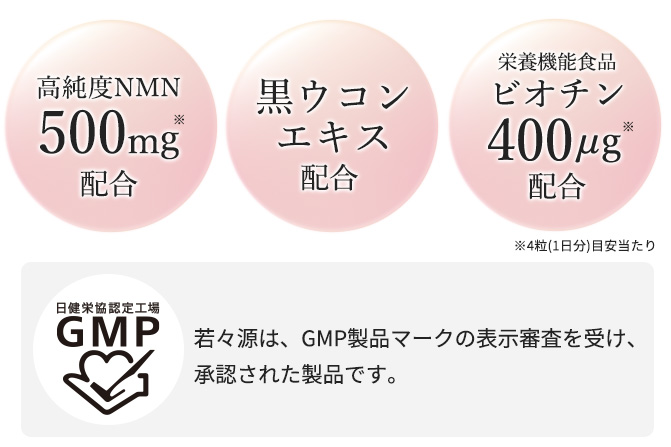 若々源には高純度NMNに加え、若々しさをサポートする黒ウコンエキスと美しさをサポートするビオチンも配合。耐酸性ハードカプセルで胃酸から守り、しっかり腸まで届けます。また GMP製品マークの表示審査を受け、「安全につくられて一定の品質が保たれた安心な商品」であることが承認されています。