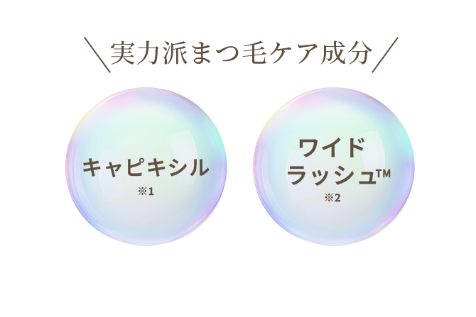 育毛剤などに配合される話題の実力派成分キャピキシルと、世界初のまつ毛ケア成分ともいわれるワイドラッシュ™で強く、ハリのあるまつ毛をサポート。
