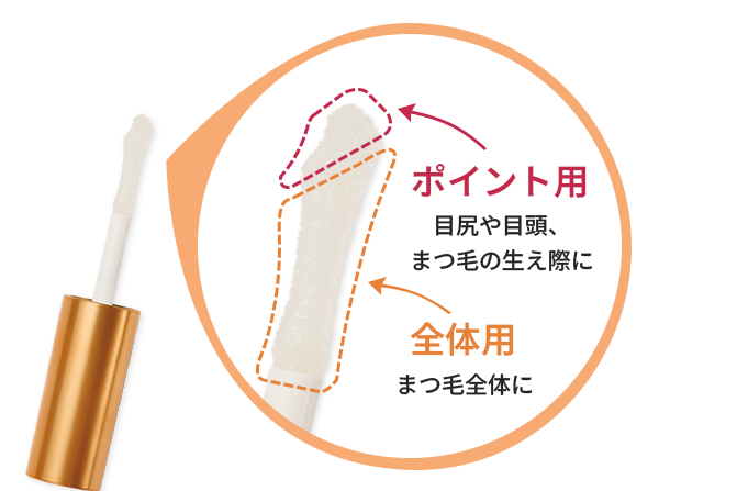 乾燥や加齢などの影響でボリュームダウンしがちなまつ毛を、やさしくケアするまつ毛用美容液。まつ毛に特化した成分を厳選配合し、目もとをいたわる無添加*2&アルコール*3フリー処方。大きなチップは、目尻・目頭などにも塗りやすい先端のポイント用と、中央部は一度でたっぷり塗れる全体用。生え際から毛先までしっかりケアし、夜1回の使用で強くしなやかな美まつ毛に。