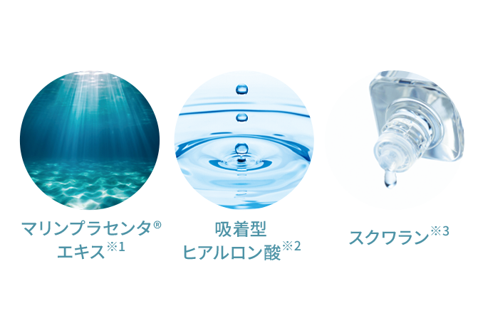 ※1 加水分解サケ卵巣膜エキス(保湿成分) ※2 ヒアルロン酸ヒドロキシプロピルトリモニウム(保湿成分) ※3 保湿成分 ※ マリンプラセンタ🄬は、株式会社日本バリアフリーの登録商標です。