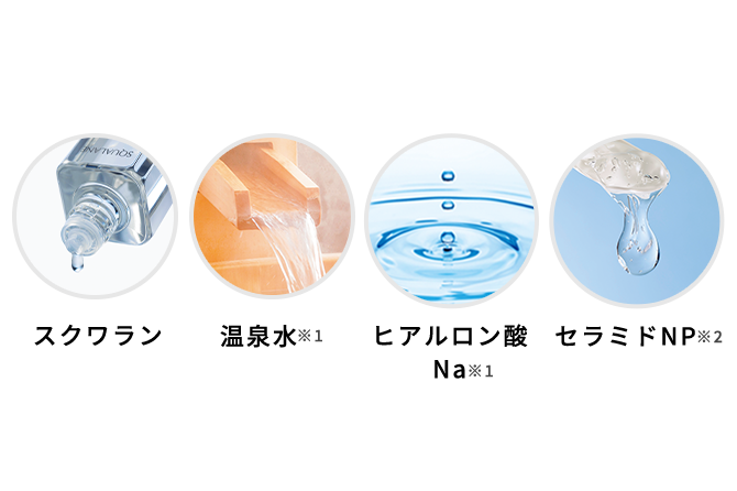 美肌の湯として名高い岡山県「湯原温泉」の温泉水※1をはじめ、スクワラン、ヒアルロン酸Na※1、セラミドNP※2などの成分を贅沢に配合。