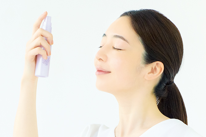 目と口を閉じ、顔から15cmくらい離して肌に直接スプレーします。