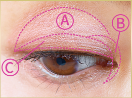 アイホール全体にⒶをぼかし、上まぶたのキワにⒸを入れて目もとを引きしめます。目頭にⒷを入れると立体感が生まれ華やかに。