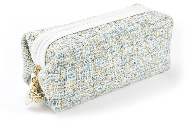ゴールドとブルーの糸を織り込んだ、上品で華やかなポーチ。コフレのアイテムもすっぽりとおさまります。