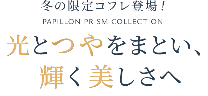 今年の冬限定コフレはパピヨン(蝶)をあしらった可愛すぎず上品なセットで、輝きと透明感*1をプラス。ここでしか手に入らないパウダーコンシーラー・アイカラー・リップはもちろん、ツイード生地のコスメポーチもぜひ手にしてほしい一品です!パピヨンパール*2が放つ微細な偏光パールで、この冬を素敵に彩りましょう。