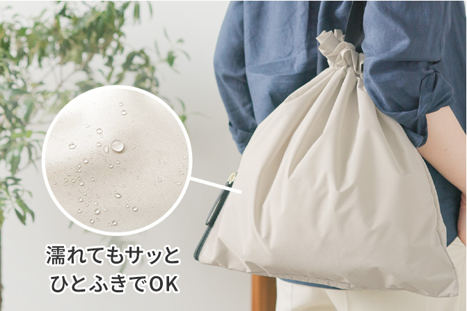 シルクのような光沢感が上品な巾着タイプにもなる大きめのバッグ。口が絞れる上、生地表面に撥水・防汚加工を施しているので梅雨時にも大活躍です。ポケットの内側には吸水性にすぐれたマイクロファイバーを使用し、折りたたみ傘などの水滴をしっかり吸水。バッグの中を濡らすことなく、快適に持ち歩くことができます。
