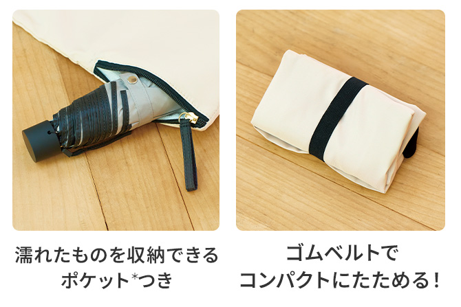 撥水・防汚加工で雨の日にも安心!便利な吸水ポケットつき!