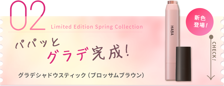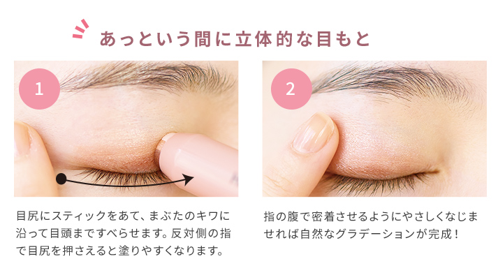 発売するたび完売のアイカラーに春らしい新色が登場しました。3色の濃淡カラーを組み合わせたスティックをまぶたに沿ってひと塗りするだけで簡単にグラデーションが完成!スクワラン※1配合でしっとりつやのある仕上がりに。