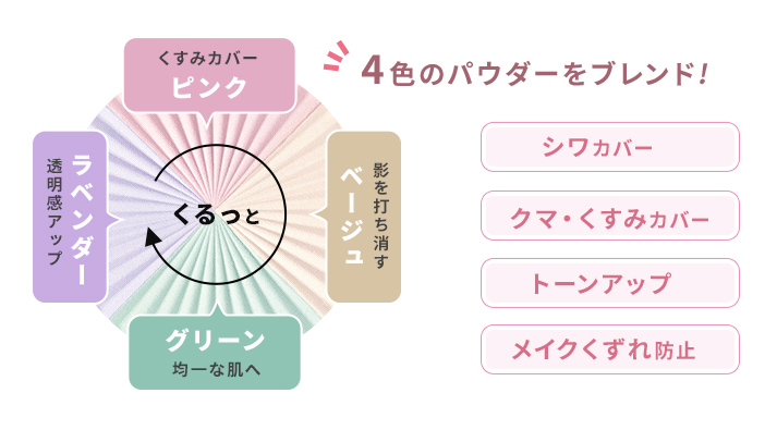 肌なじみのよいピンク・ベージュ・グリーン・ラベンダーの4色のパウダーを混ぜ合わせることで、年齢サインを多角的に補整。明るく均一感のある肌印象に仕上げるパウダータイプのコンシーラー。高密着のパウダーが余分な皮脂を吸着し、メイクしたてのキレイをキープします。